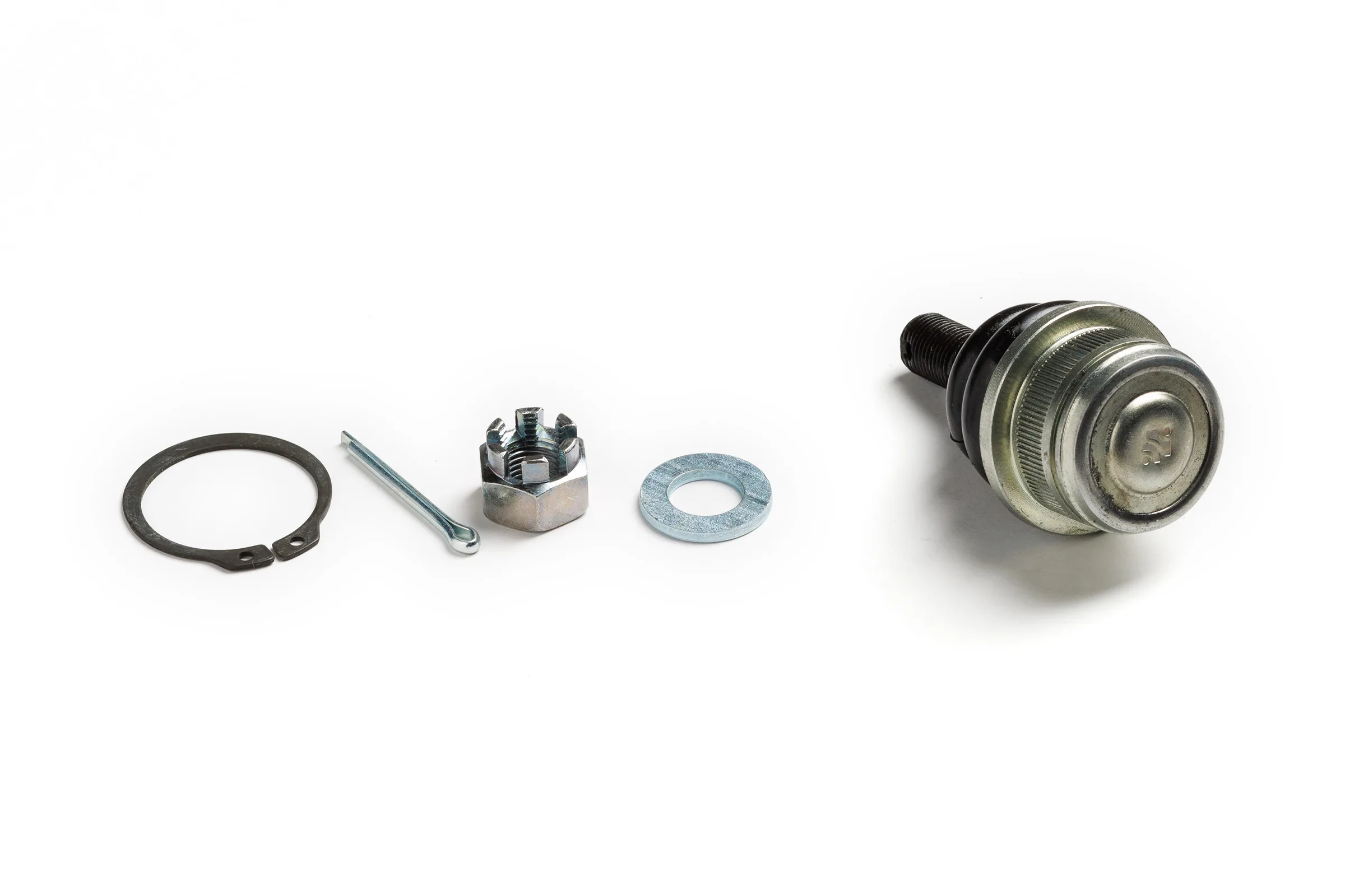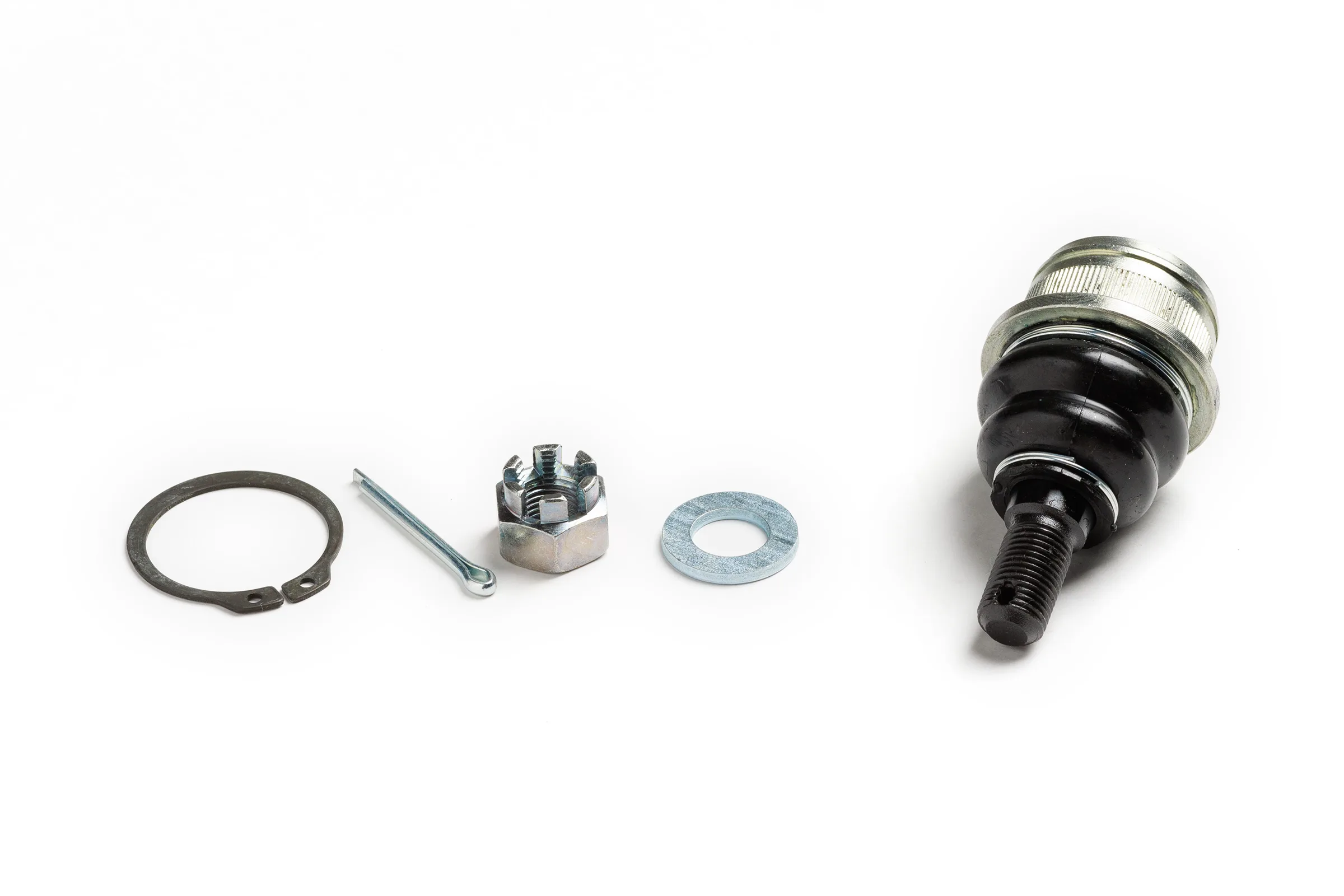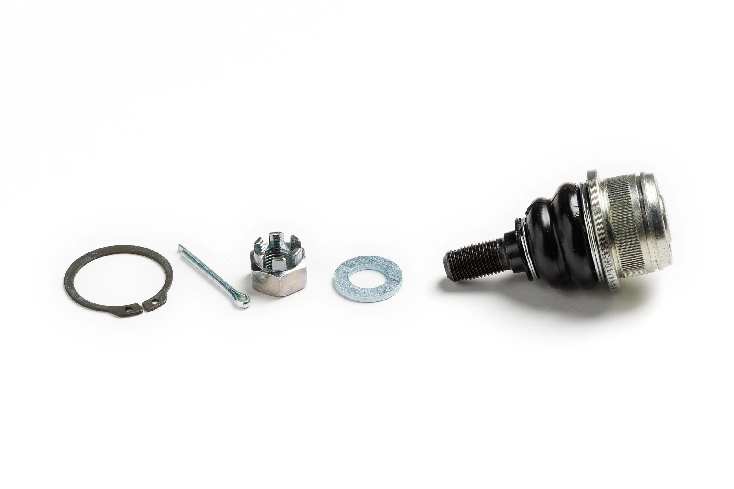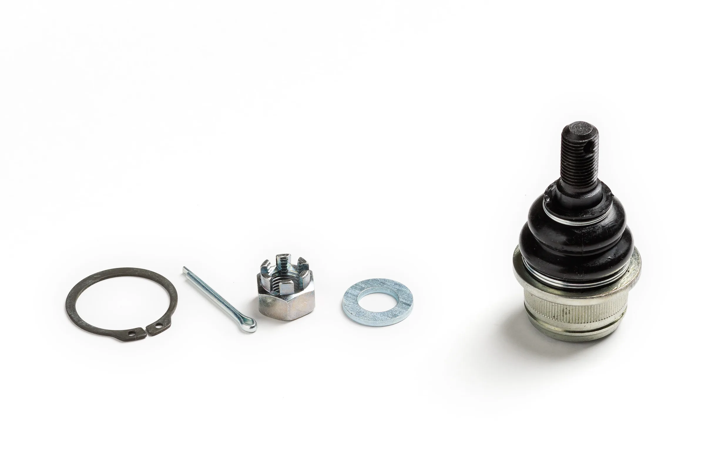 Гайка, шплинт шарового пальца, стопорное кольцо для надёжной фиксации шарнира в рычаге, шайба.